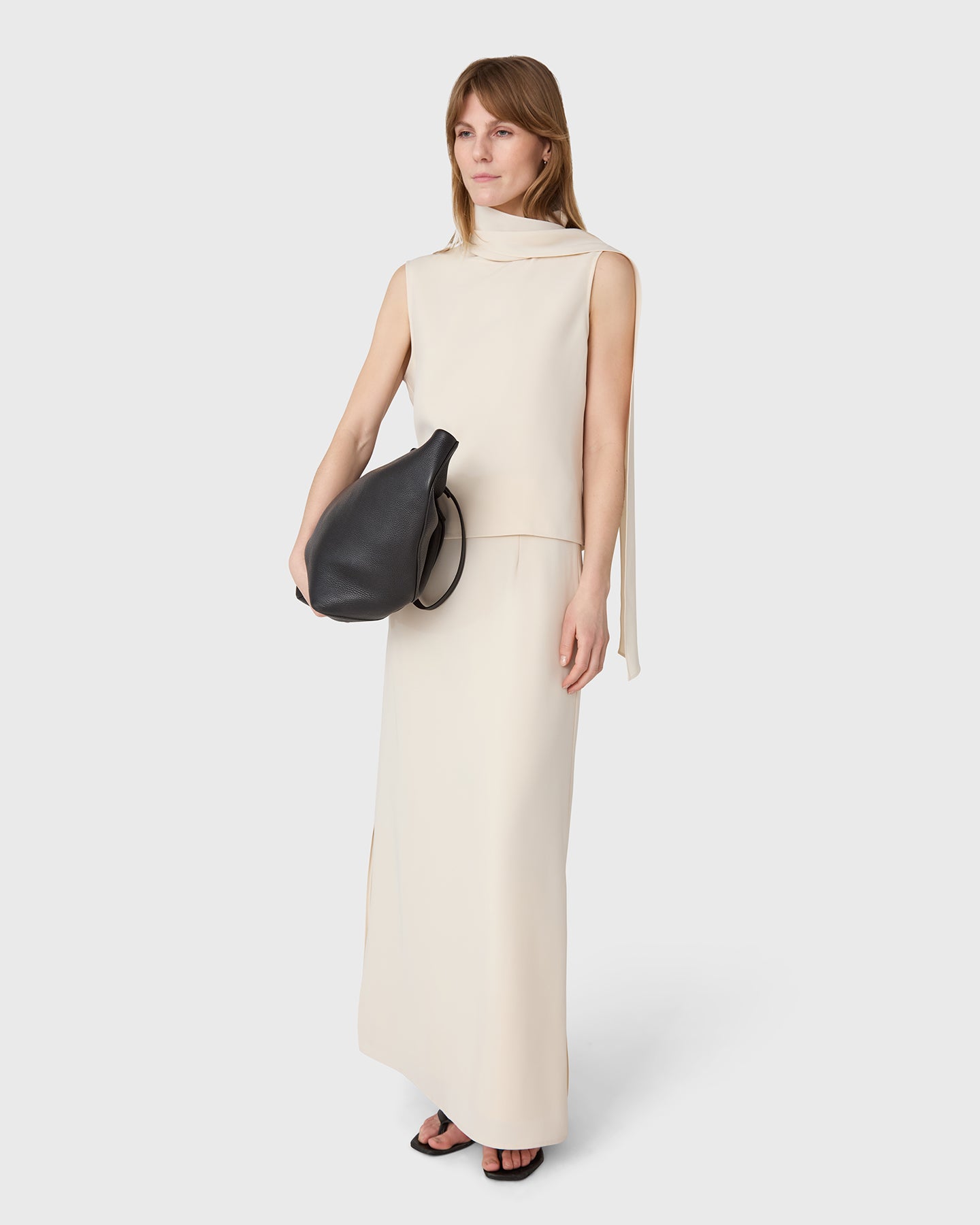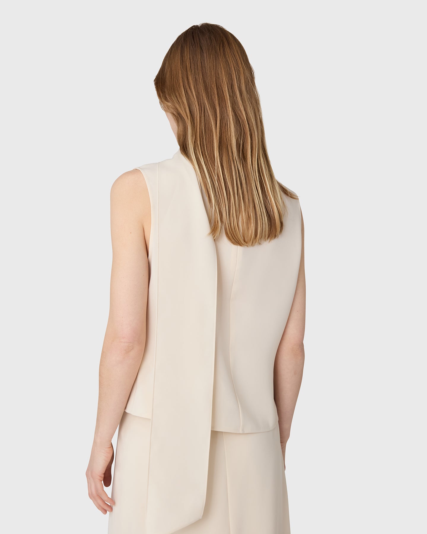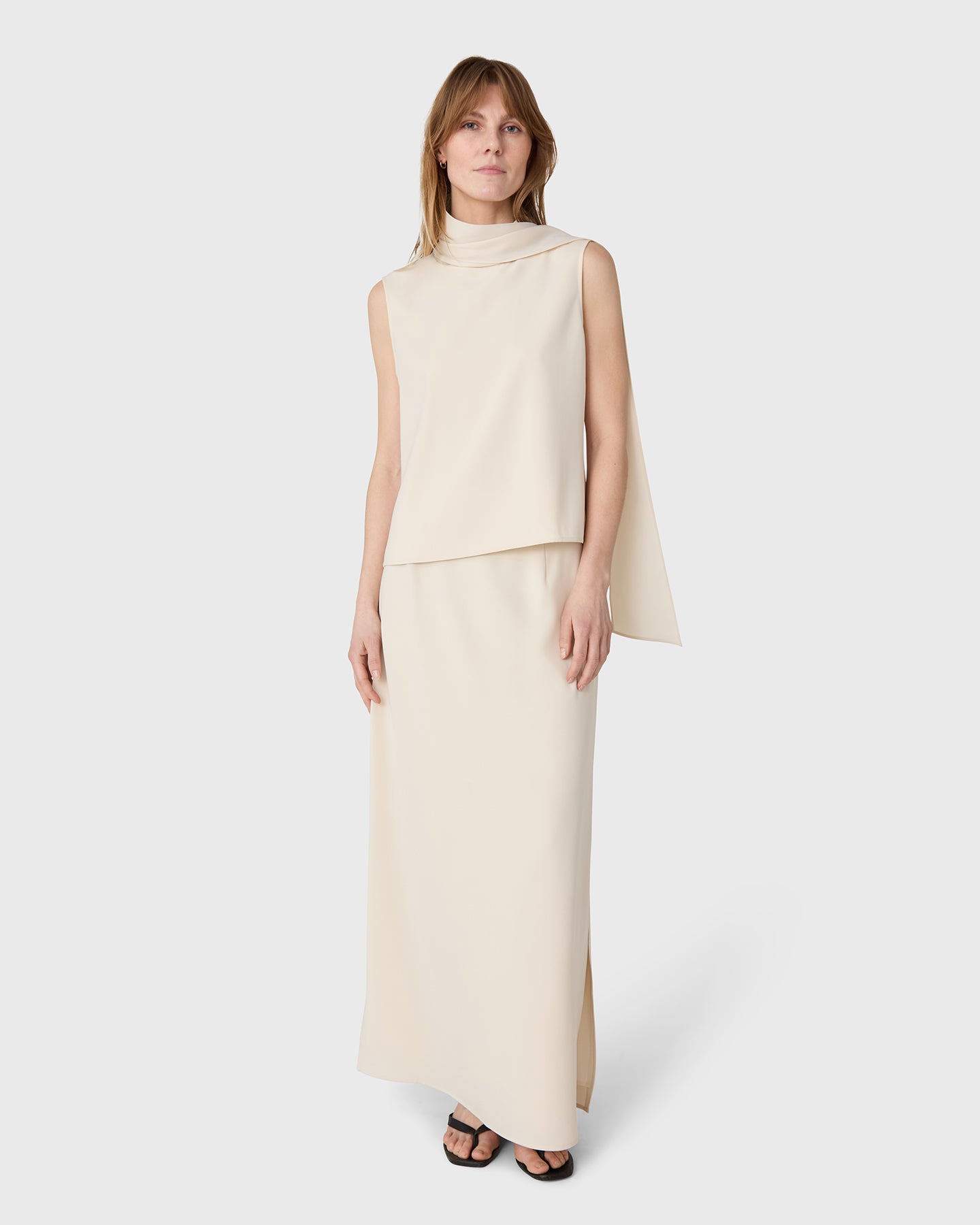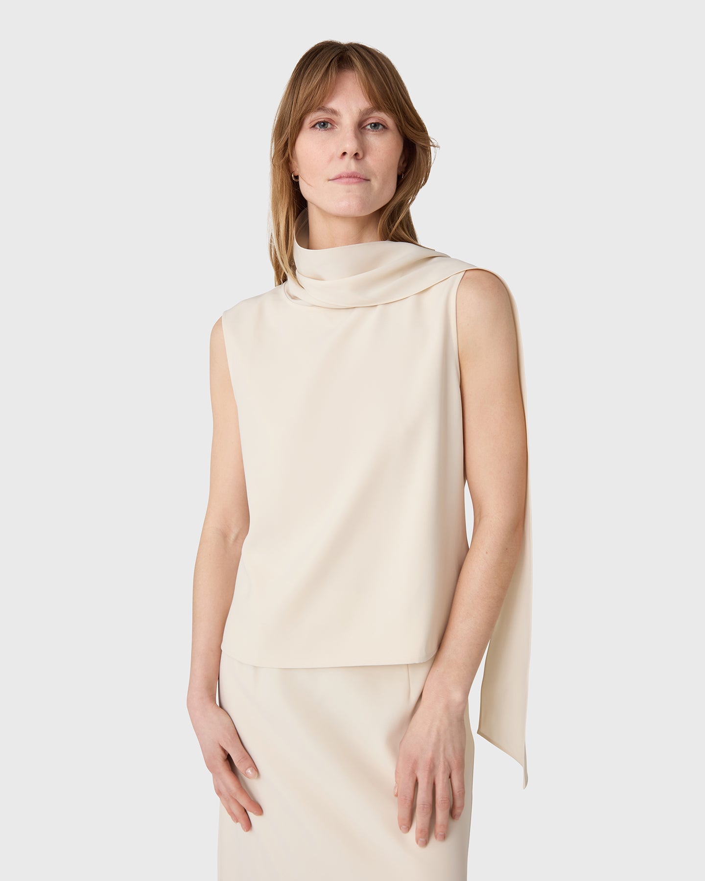 The Orly Turtleneck Top is a sleeveless turtleneck top in twill with a scarf detail. Wear as a set with the matching Marlow Skirt, or worn on its own.