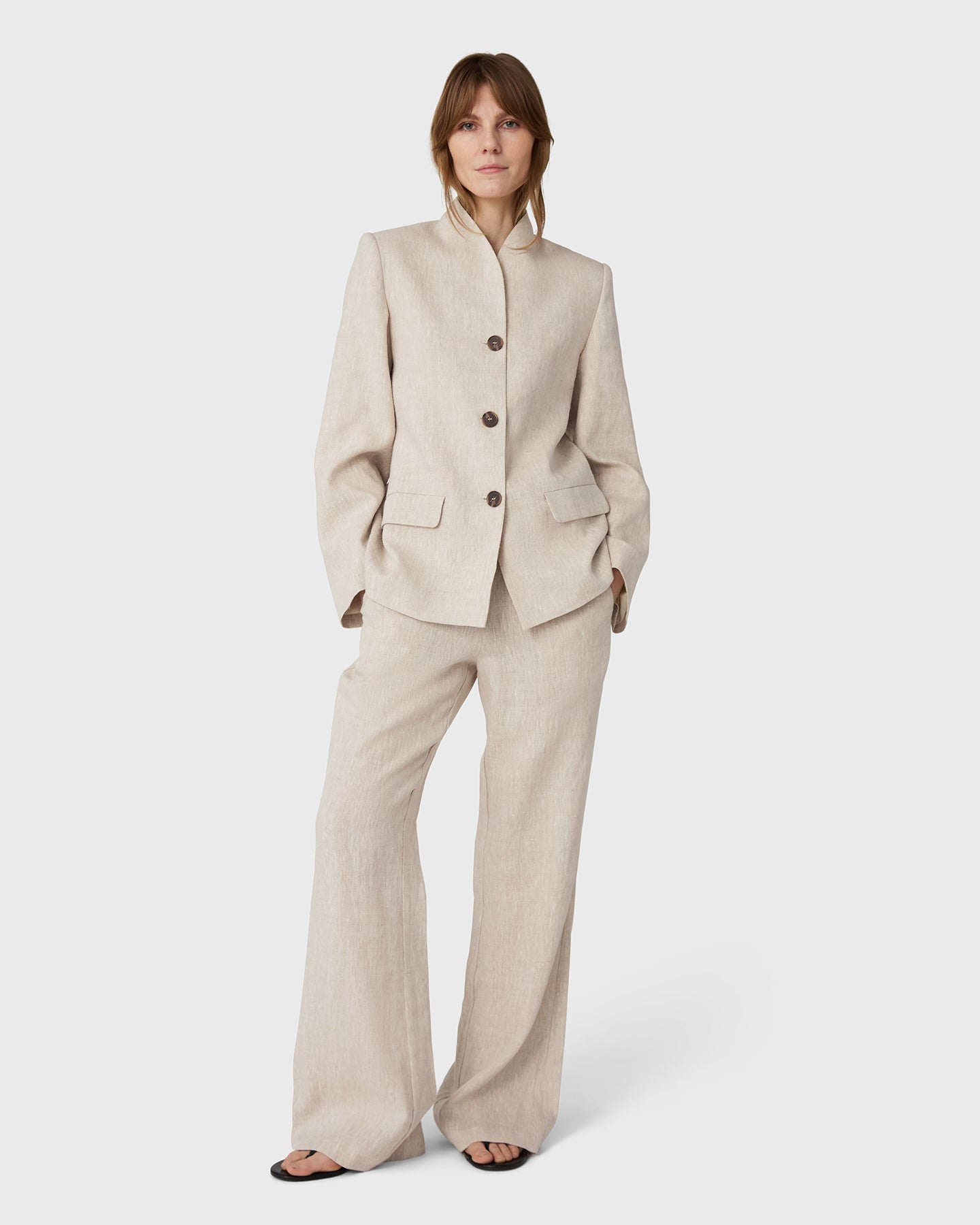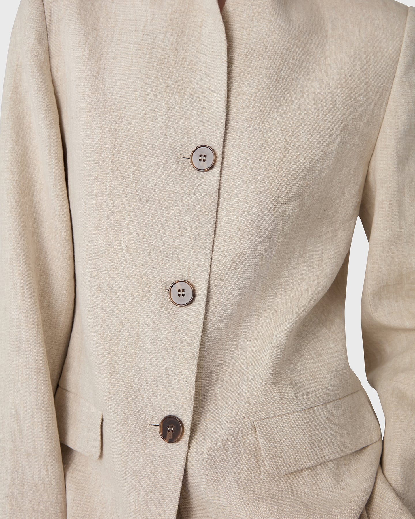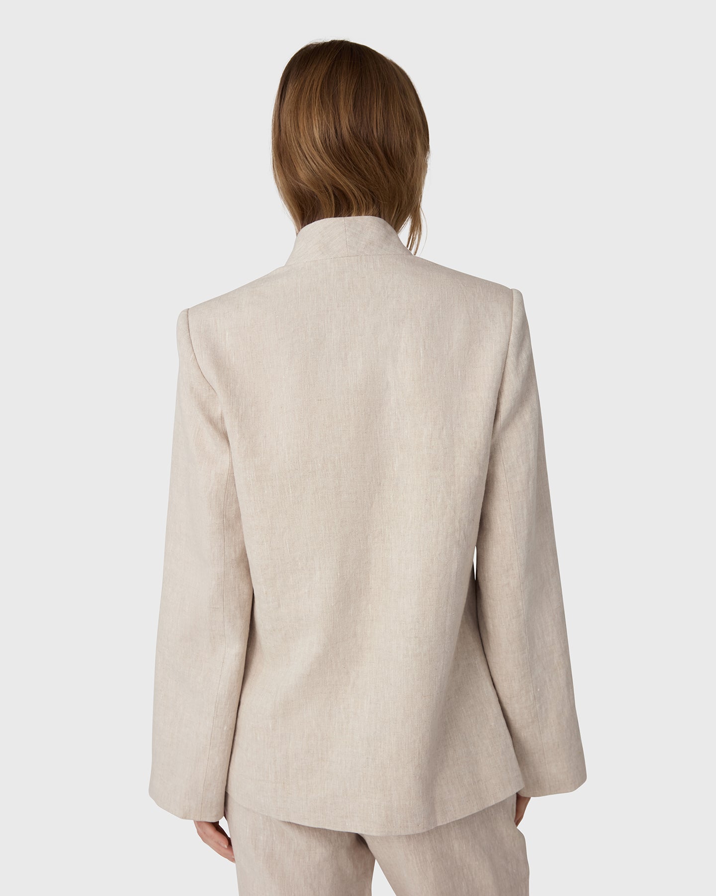 The Remi Linen Blazer in 100% linen. Defined by its stand up collar and horn button details, this linen blazer balances structure with lightness.