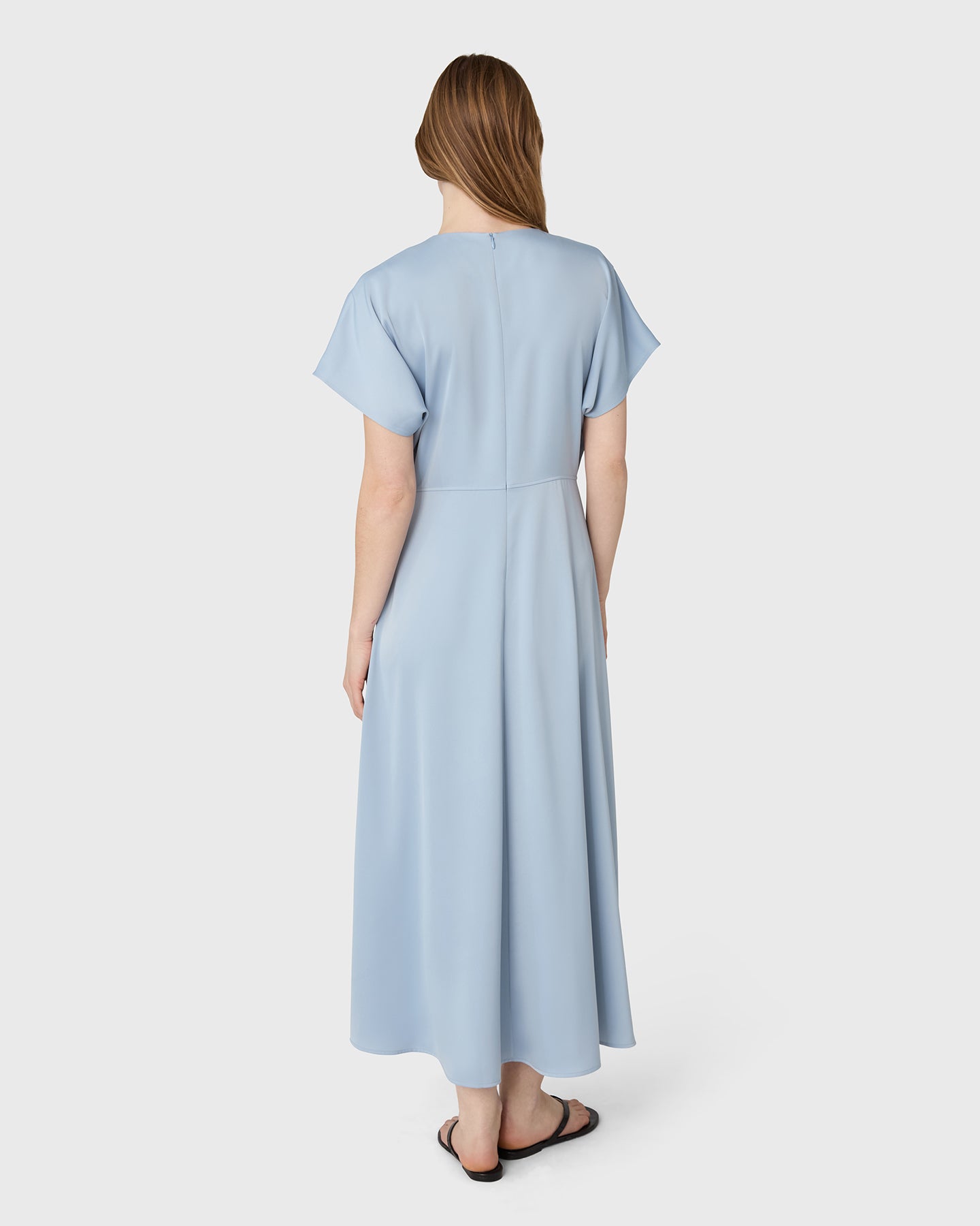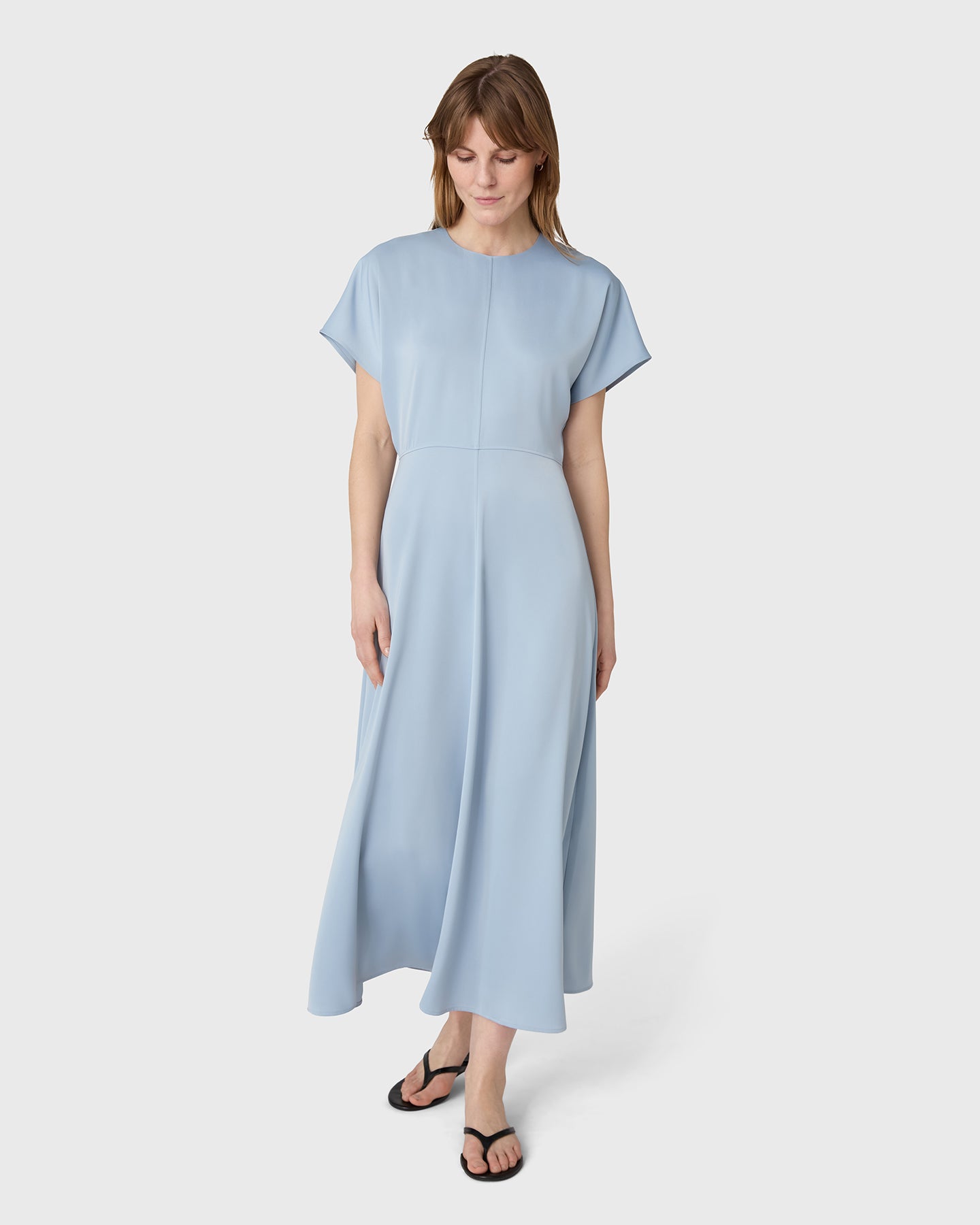 Rhonda satinklänning har en mjuk rund halsringning, korta ärmar och en böljande, utsvängd kjol. De främre sömmarna formar silhuetten och tillför en subtilt skräddad känsla till den i övrigt följsamma designen. Skuren i satin stretch för komfort och ett polerat uttryck från dag till kväll, med ankellängd.