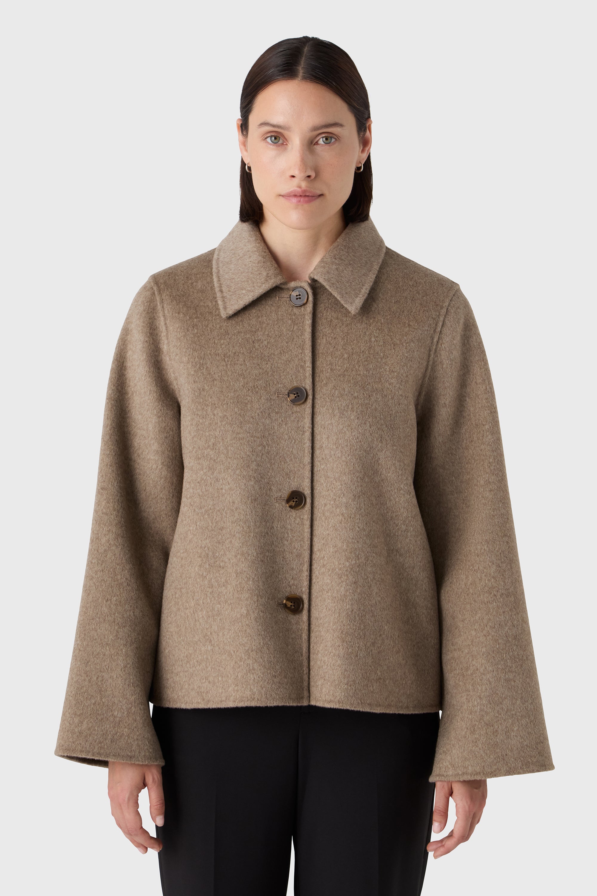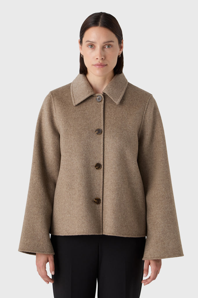 Soft structure with bold lines. The Coline Jacket is cut from 100% wool with a sculptural shape — featuring wide sleeves, a sharp shirt collar and tonal horn buttons. The cropped length balances volume and adds edge to any outfit. A modern layer for transitional dressing.