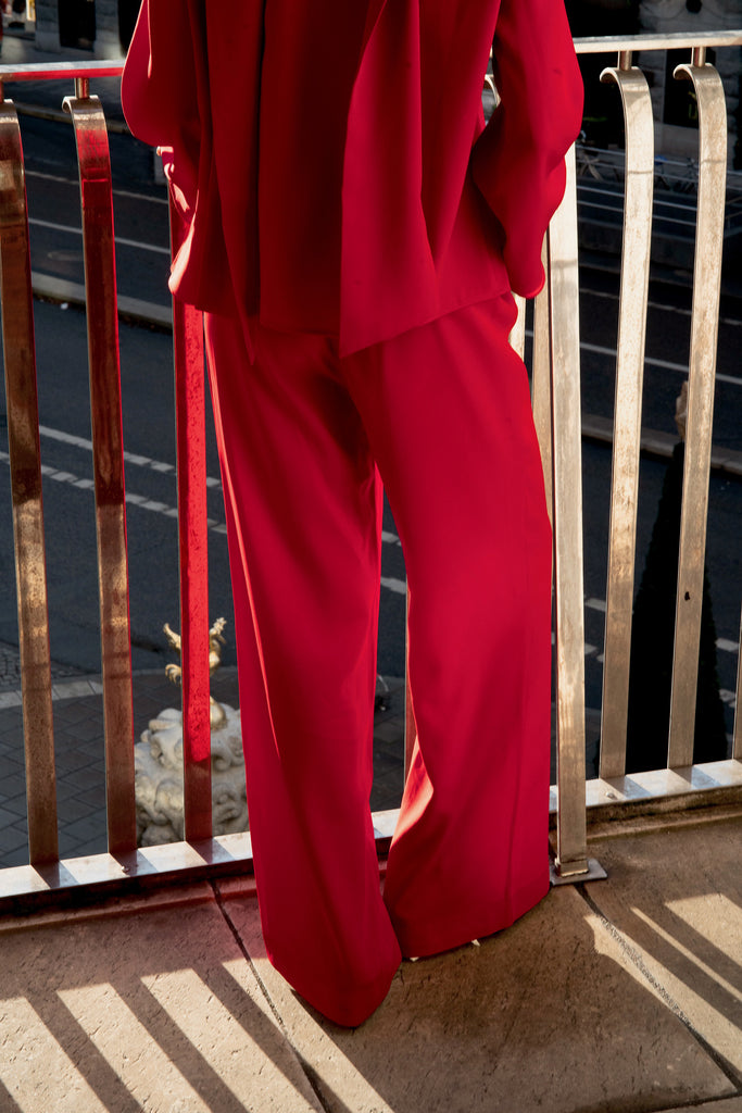 Soft volume, effortless feel. The Josephine Trousers are tailored in flowy poly twill with a wide leg and elastic waistband for all-day ease. The drape is fluid and flattering — ideal with a soft blouse or sleek knit.