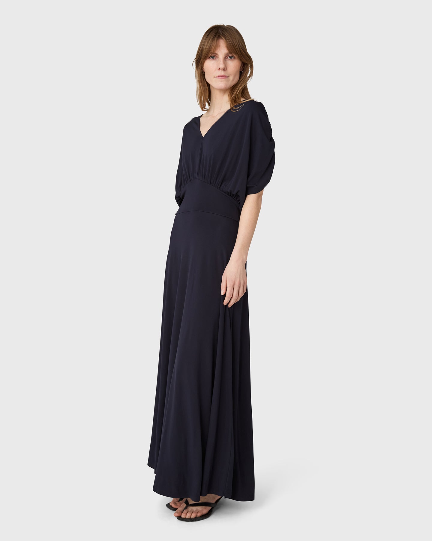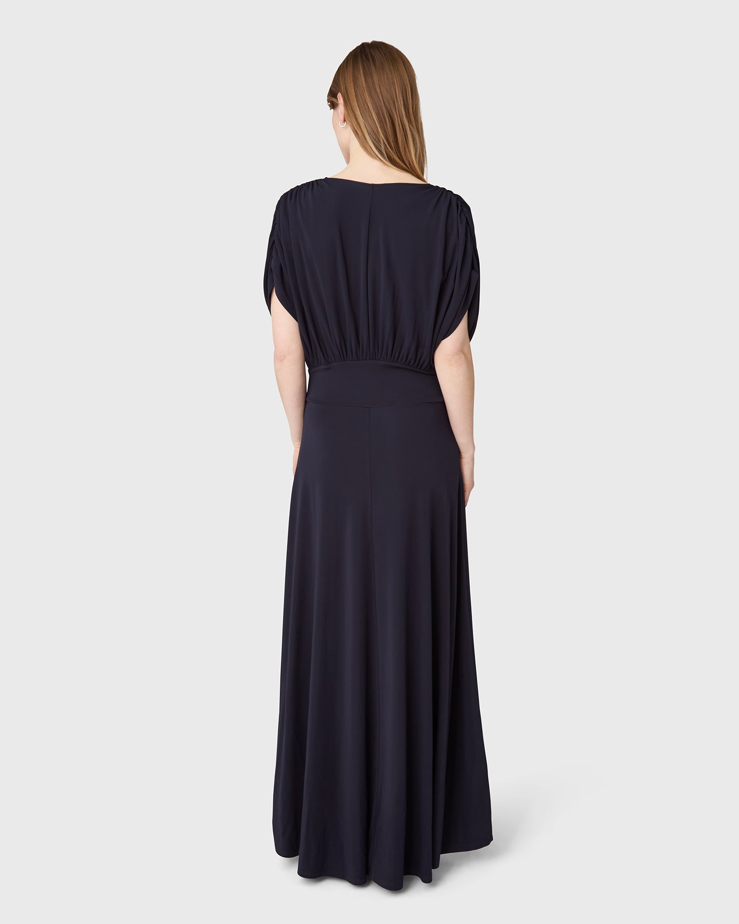 Robe à col en V en jersey de viscose, avec épaules drapées et longue jupe large. Parfaite pour un mariage, une fête d'été ou même une journée au bureau selon la façon dont vous la stylisez.