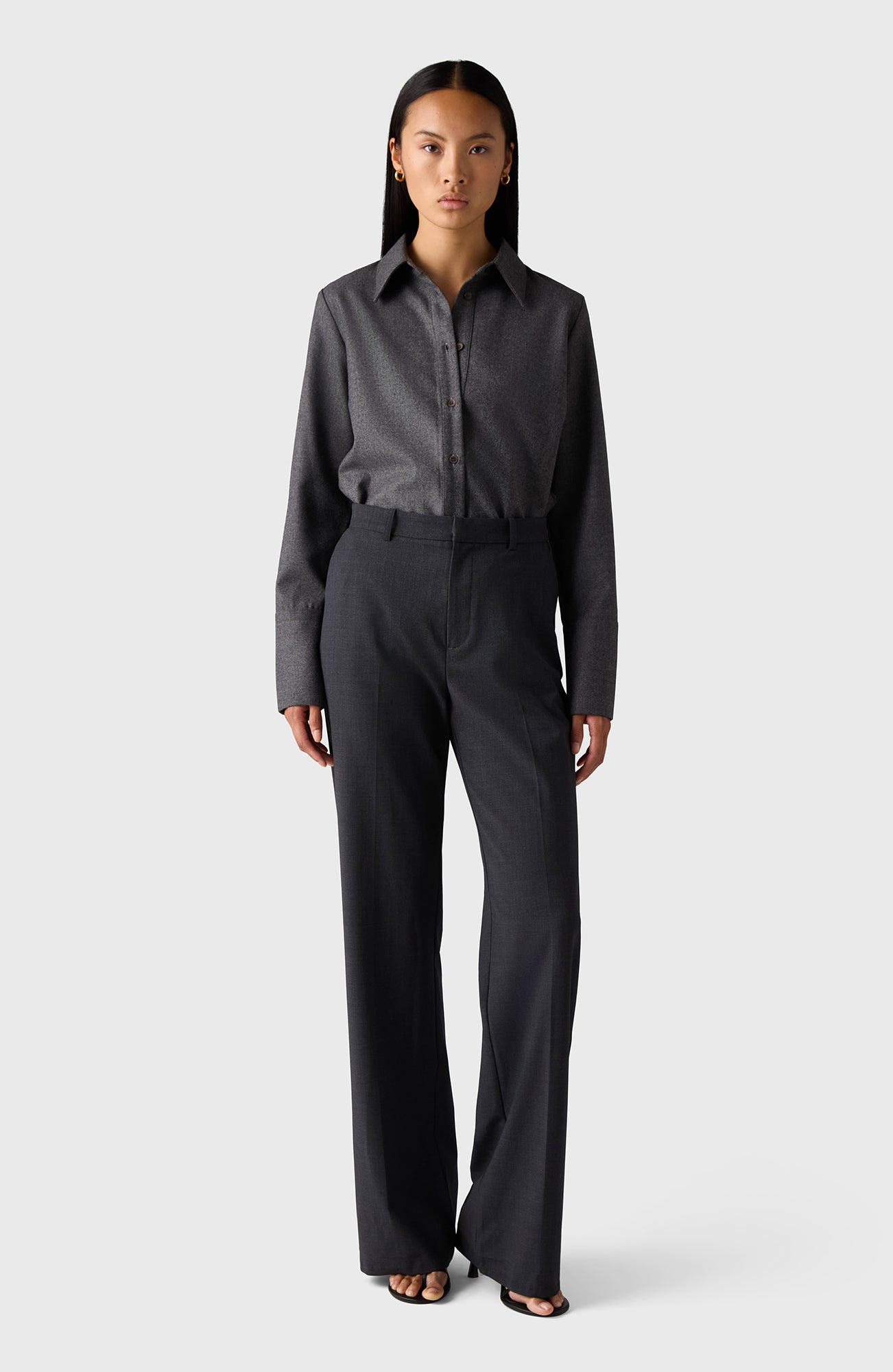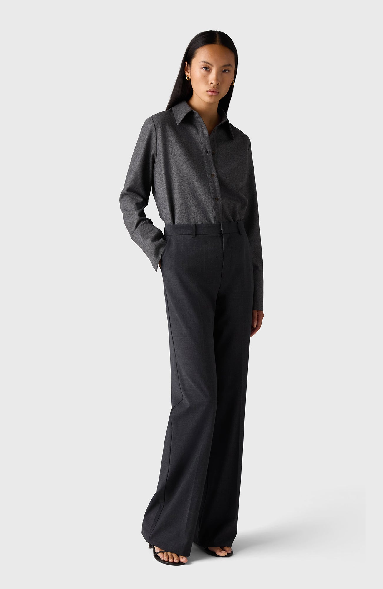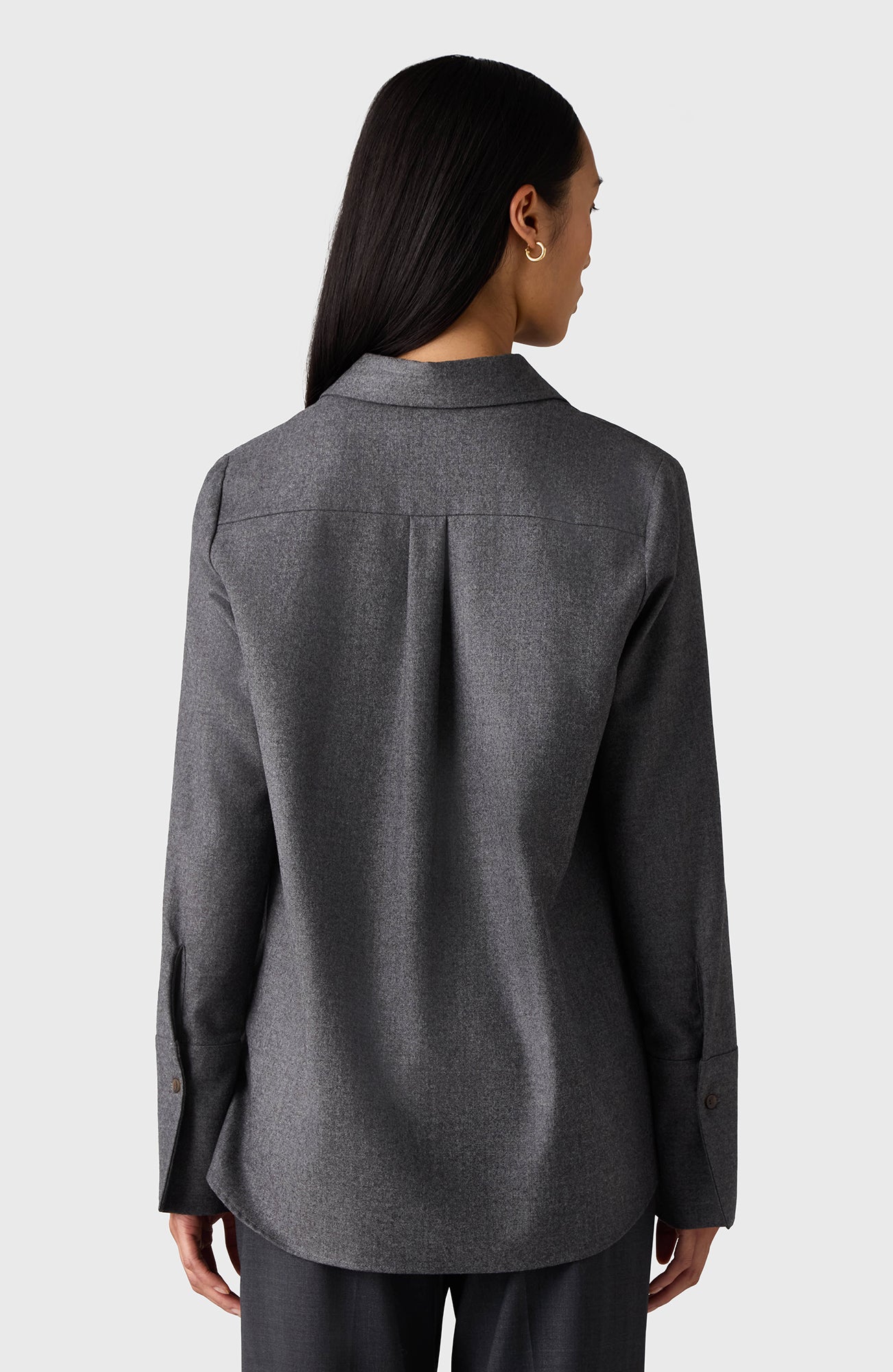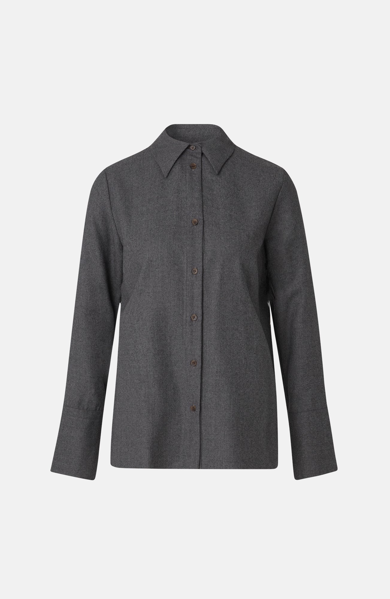The Oprah Shirt is crafted from 100% wool and features horn buttons. It has a wider, relaxed fit and is longer at the back.