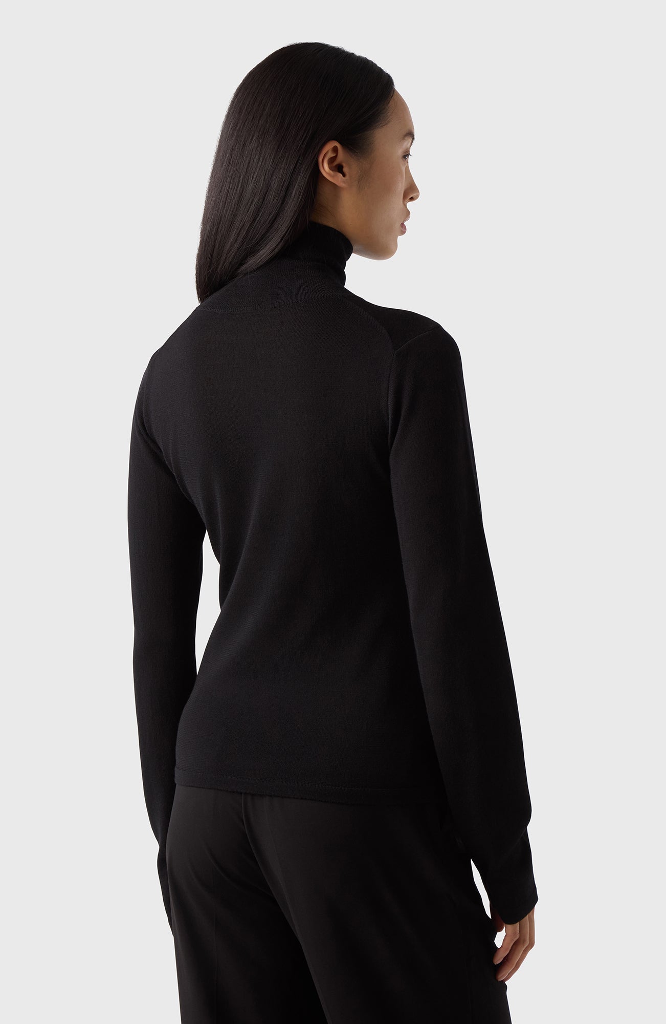 The Turtleneck comes in black and has a slim fit. It's crafted from 100% super soft merino wool, offering both warmth and comfort. Wear it with tailored trousers to dress up or denim to dress down.