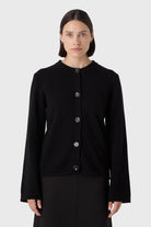A clean, sculptural knit. The Elise Cardigan is made from 100% soft wool and shaped with a round neckline, wide sleeves and tonal horn buttons. Easy to wear with trousers, denim or a soft skirt — at work or off duty.