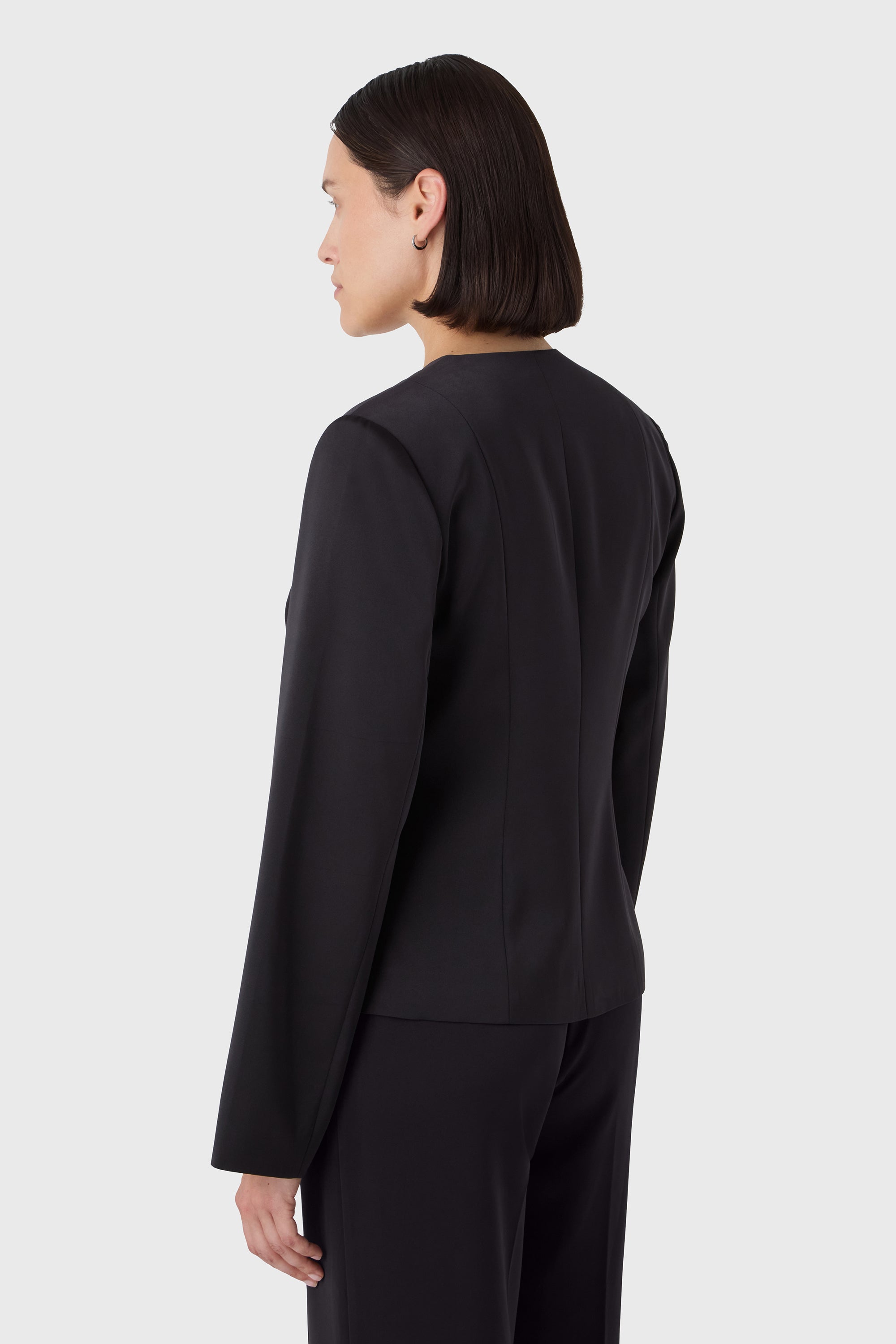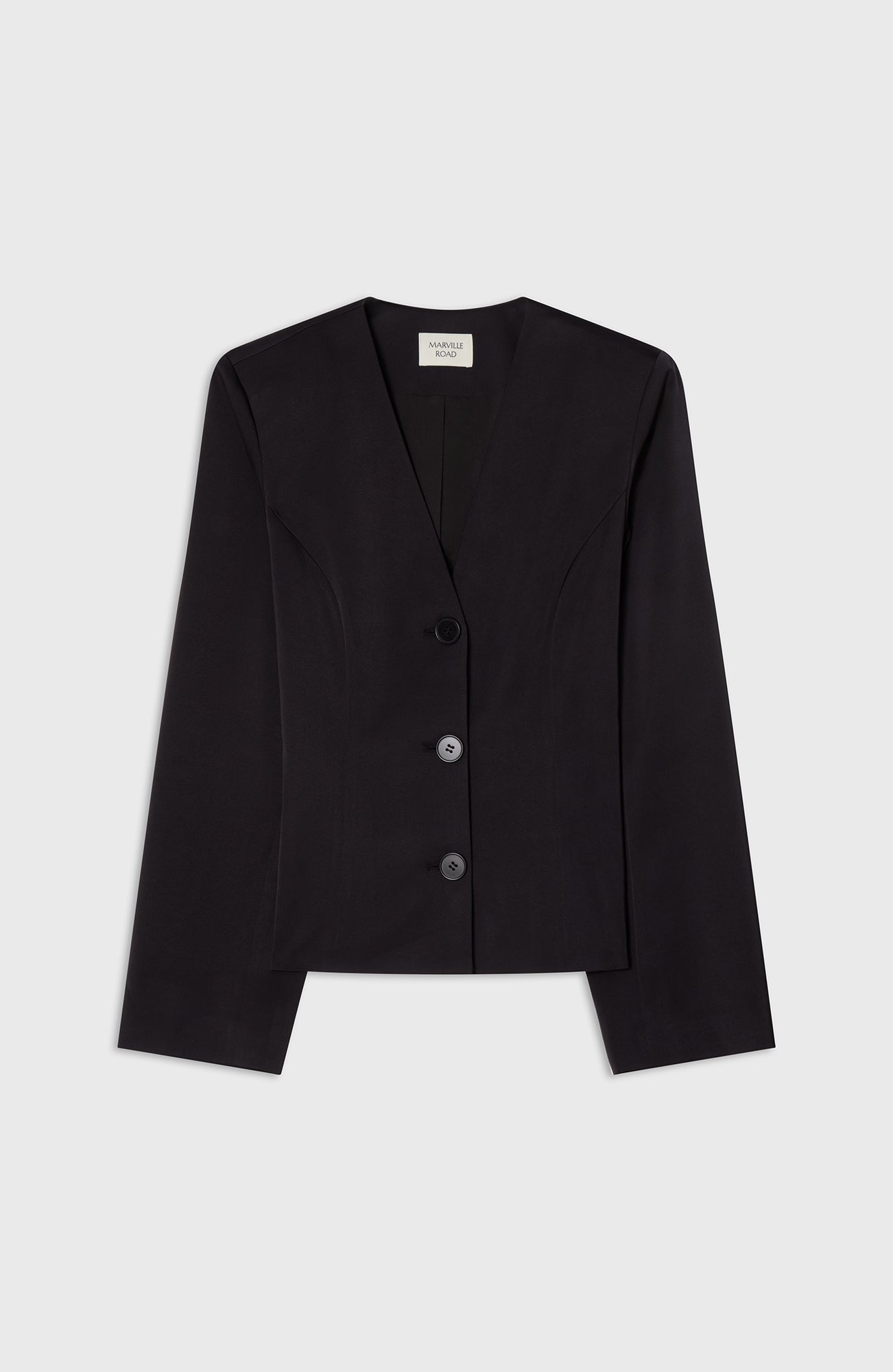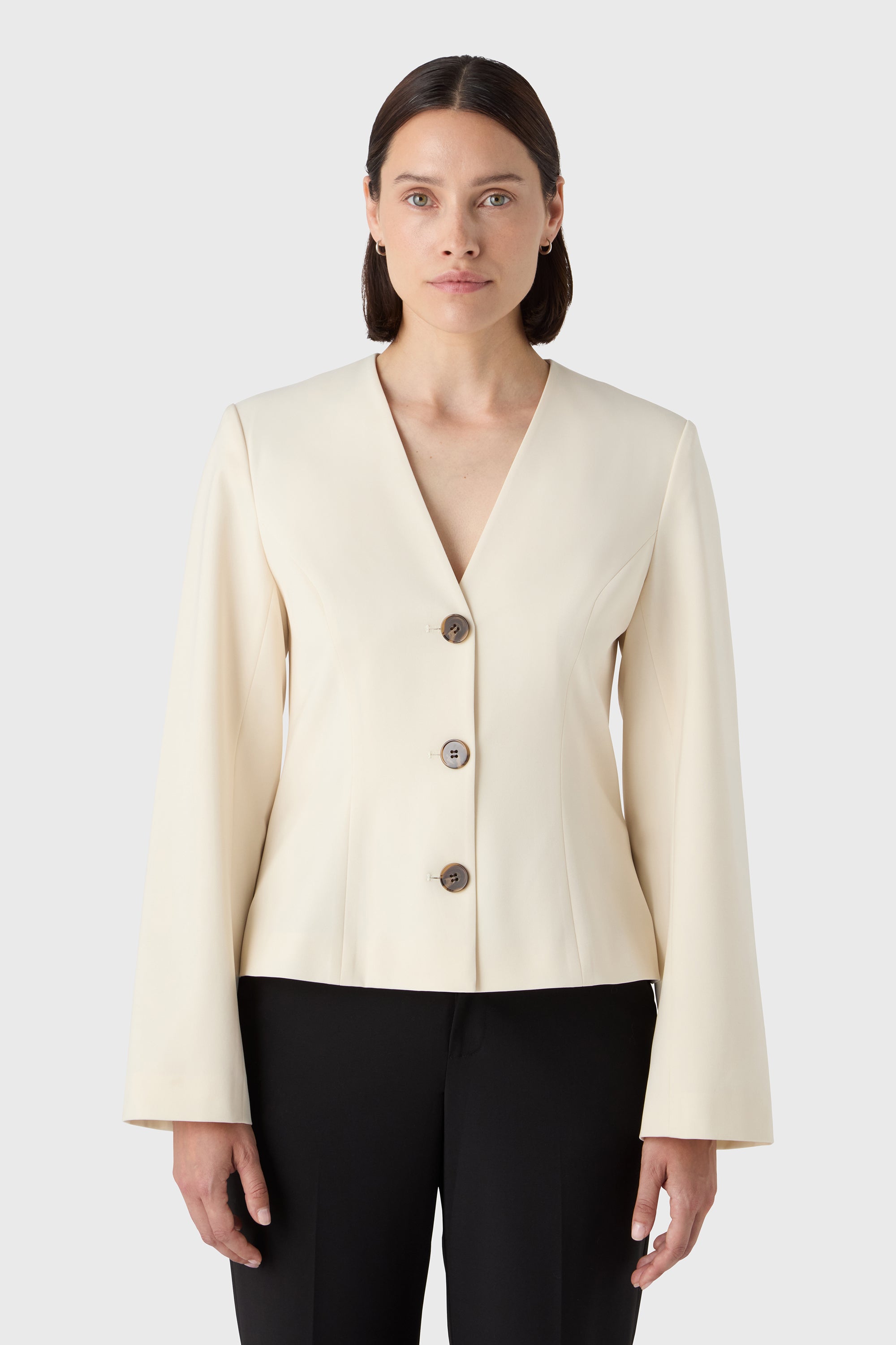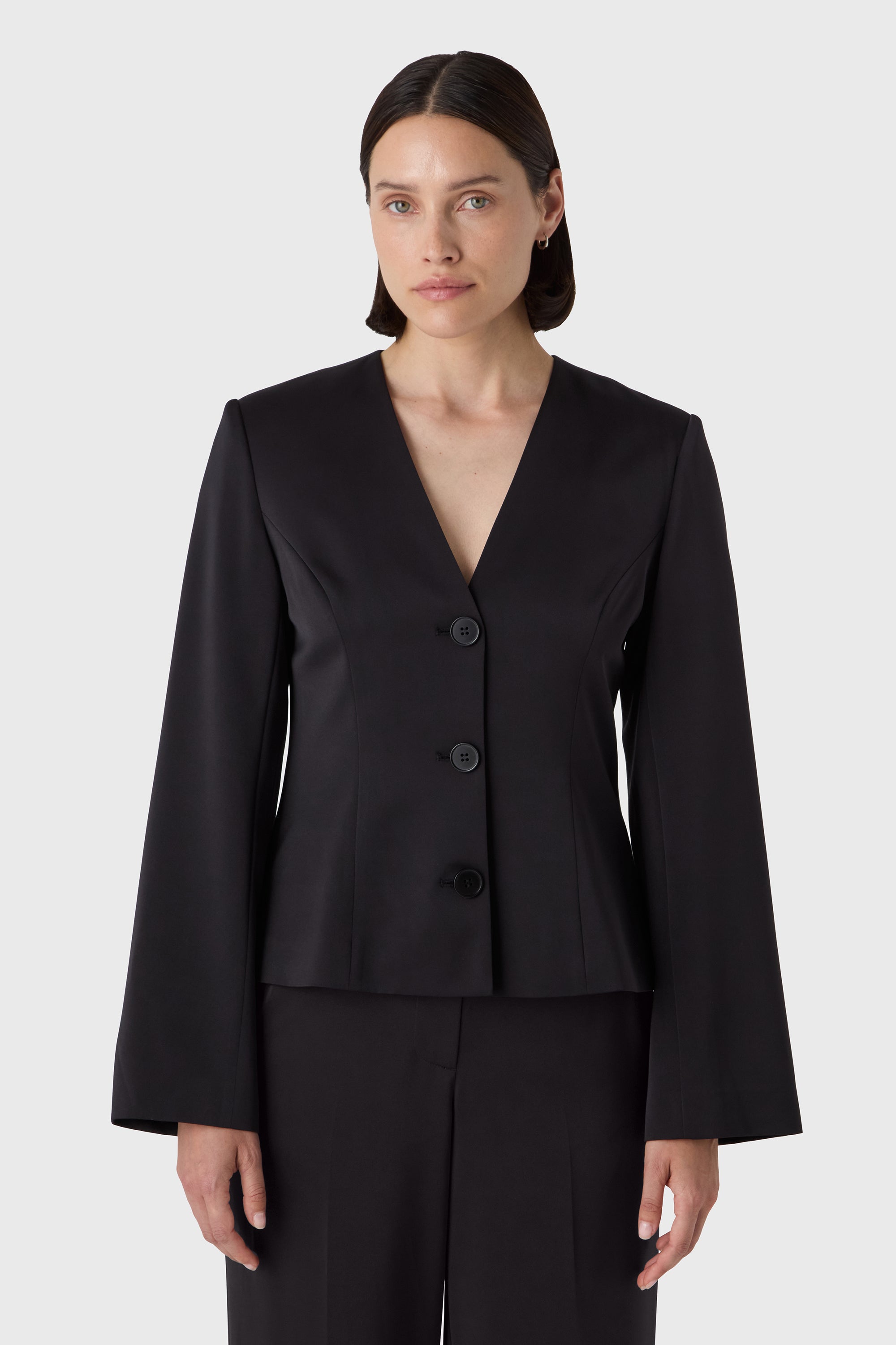 A sharp essential with soft edges. The Li Blazer features a clean V neckline, sculpted waist and long sleeves for a modern, feminine silhouette. The buttons add a quiet detail to the minimal tailoring — perfect with matching trousers or styled solo for a statement.