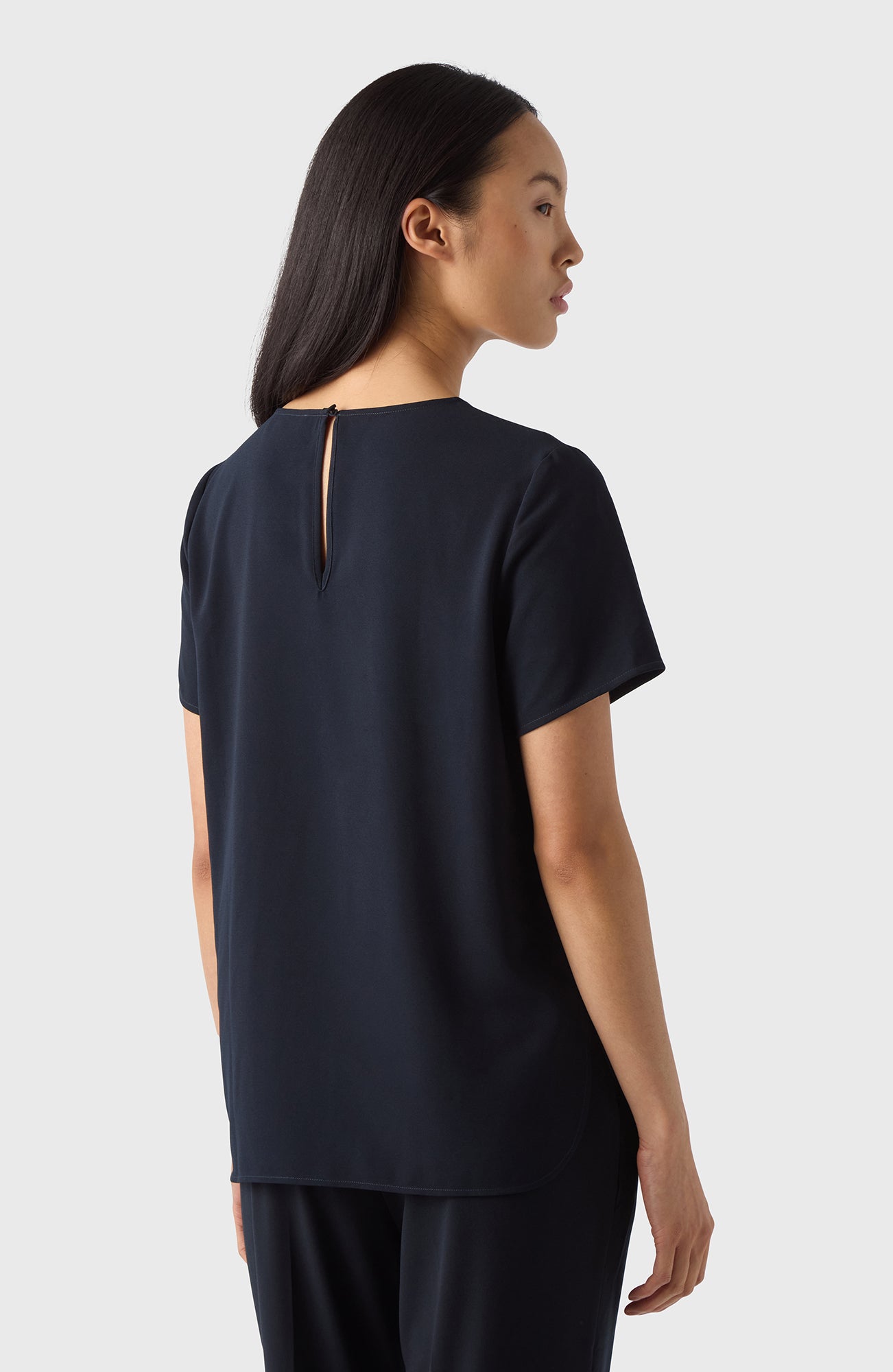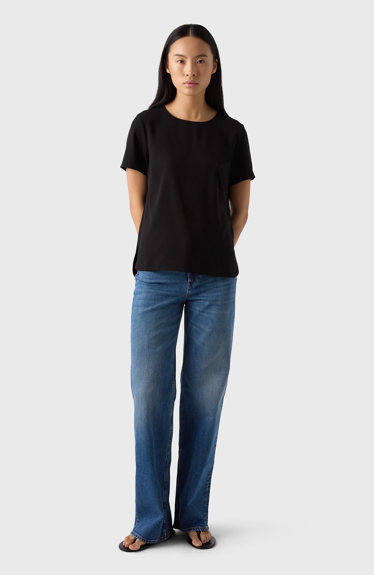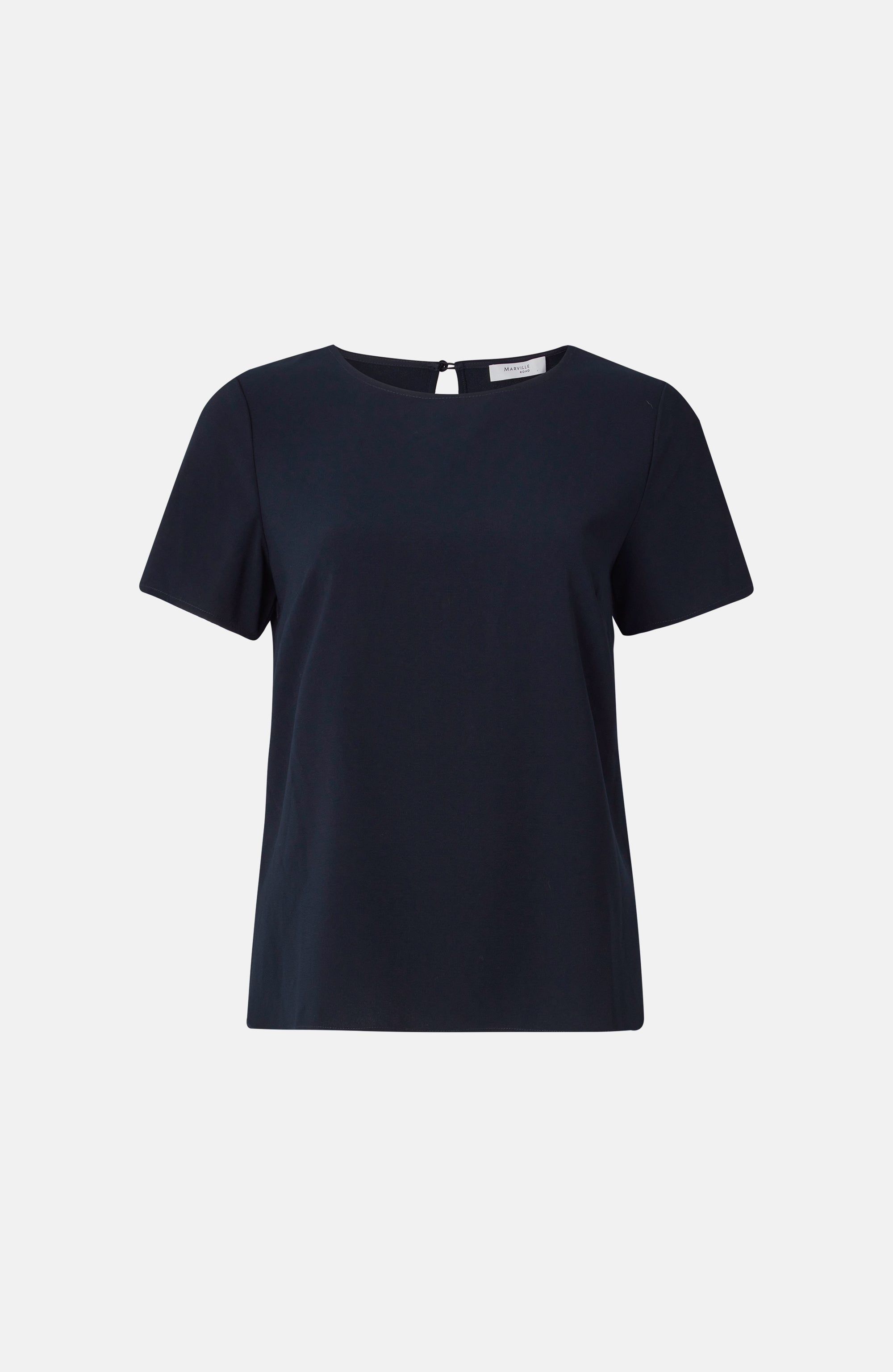 Olga top could be described as a “blouse tee” – she is more elegant than a basic T-shirt but more simple than a classic blouse. Basic yet sleek, she will add that little extra to your everyday look. Olga is designed for a slightly loose fit and has a round neckline that closes with a fabric-covered button.
