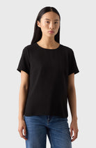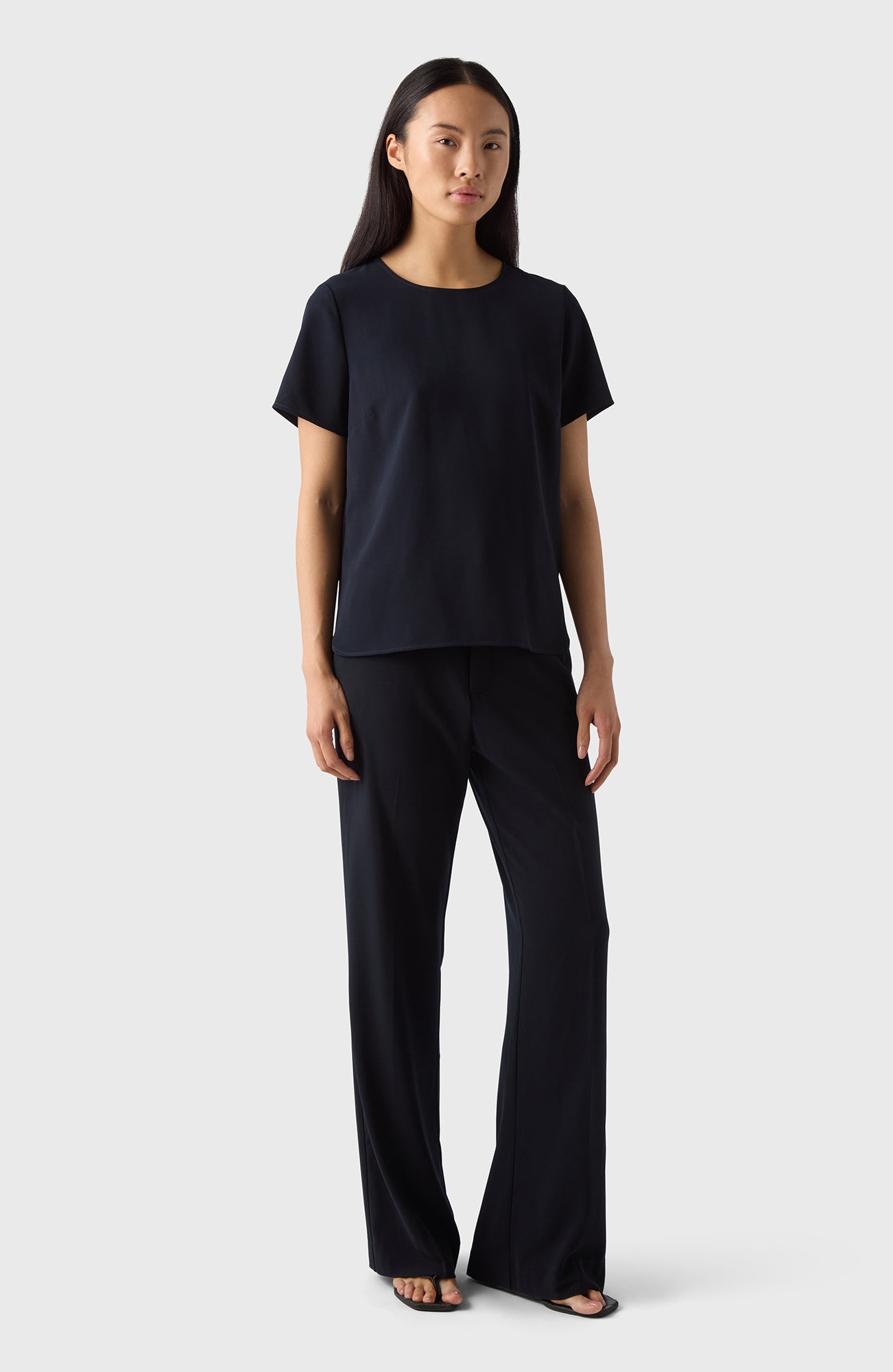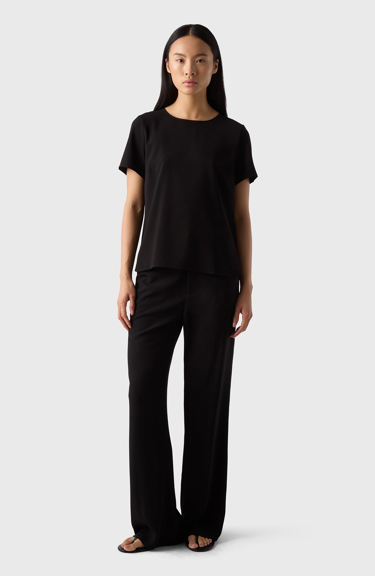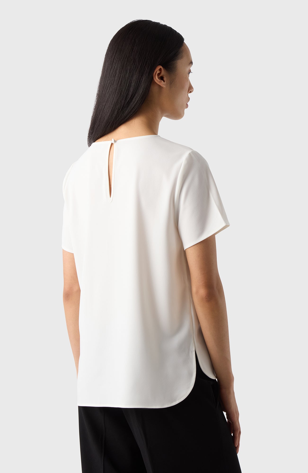 Olga top could be described as a “blouse tee” – she is more elegant than a basic T-shirt but more simple than a classic blouse. Basic yet sleek, she will add that little extra to your everyday look. Olga is designed for a slightly loose fit and has a round neckline that closes with a fabric-covered button.