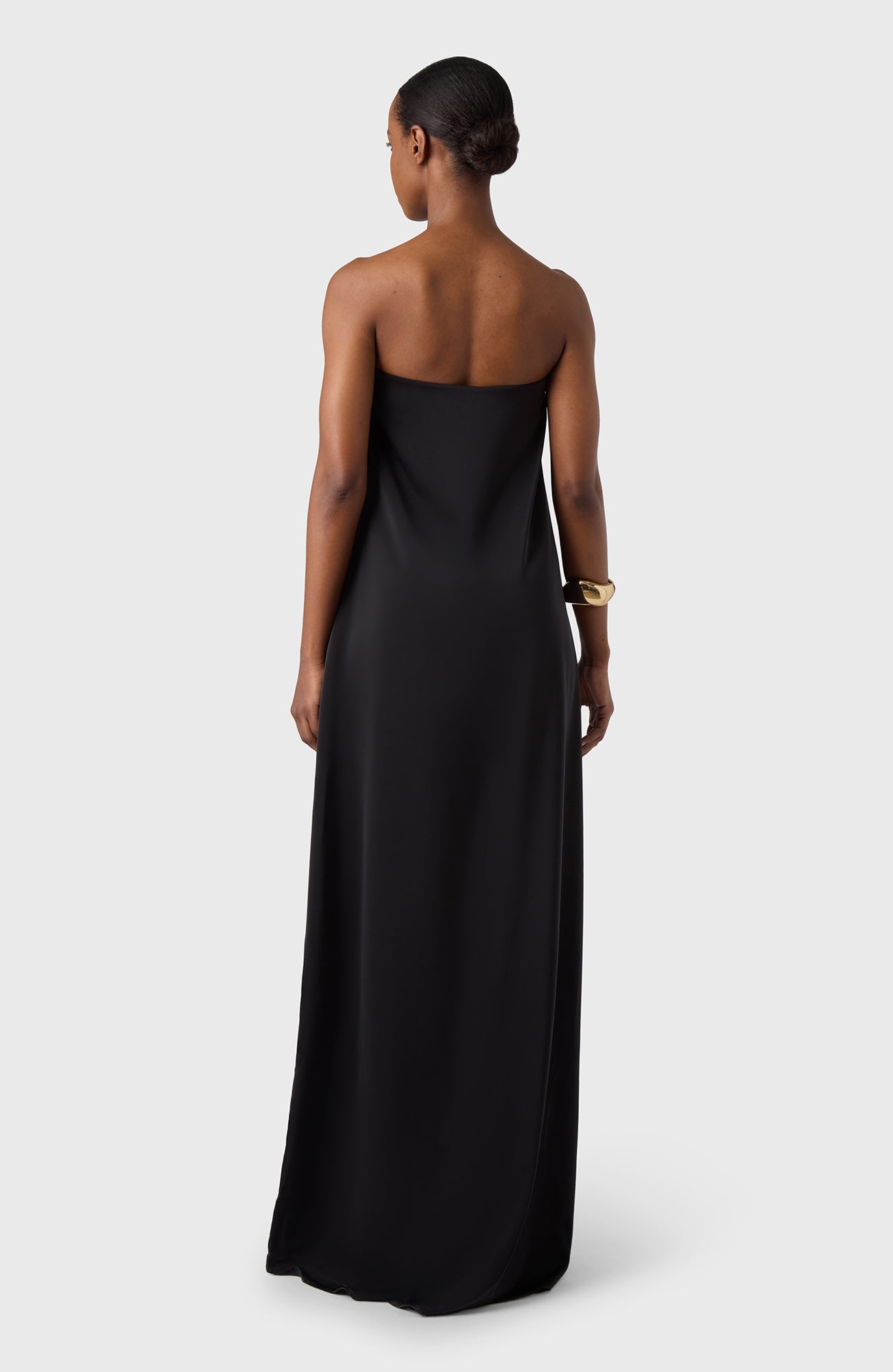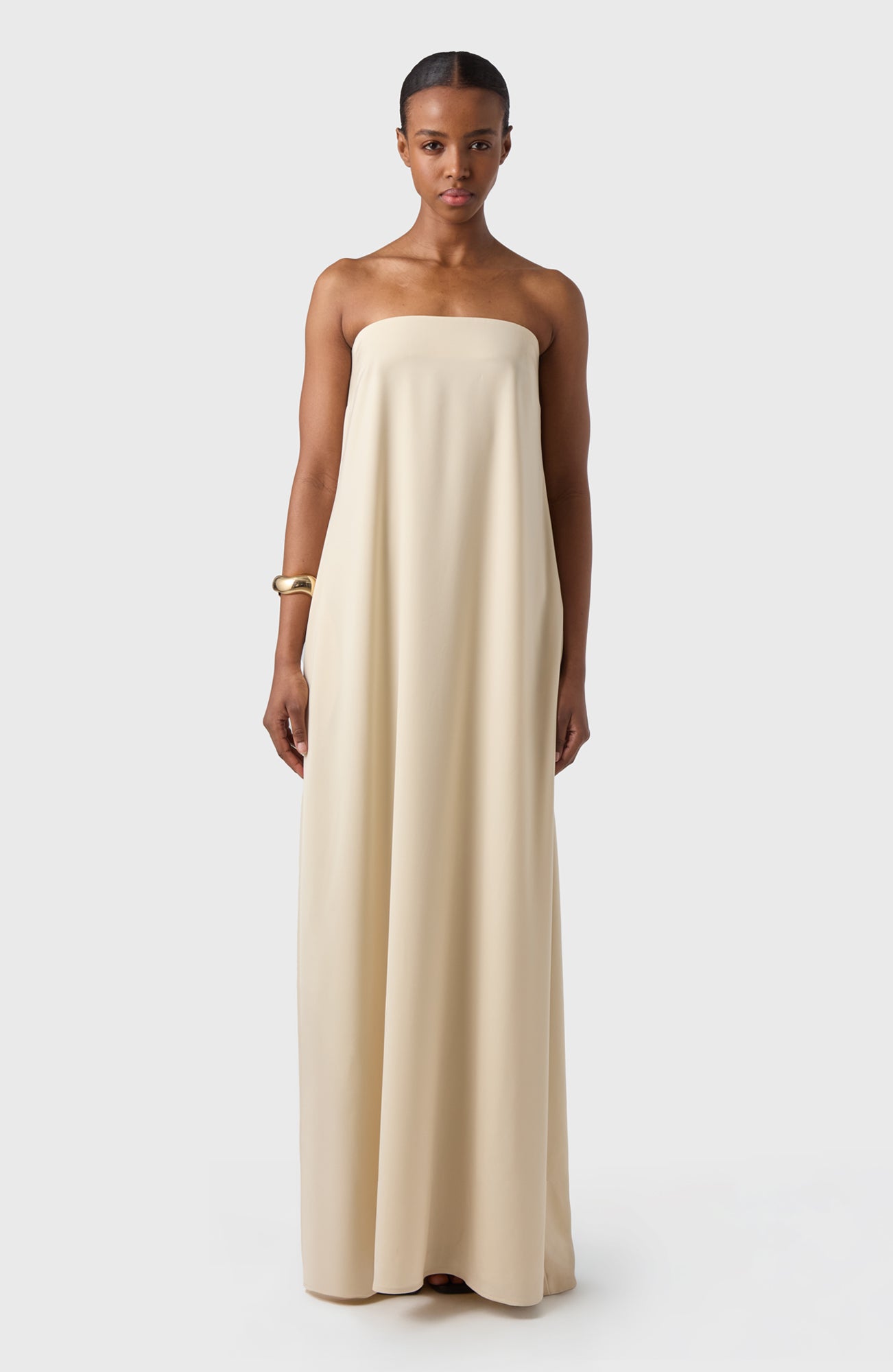 Sleeveless long Tube dress in our lovely satin stretch fabric. To wear on a warm summer days with flipflops or at a summer party with sandals.