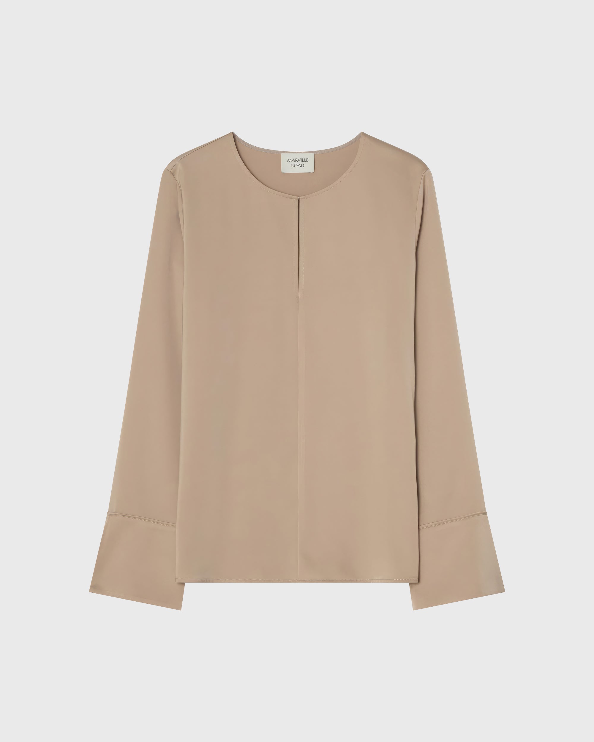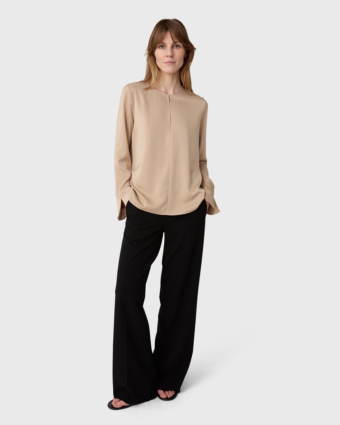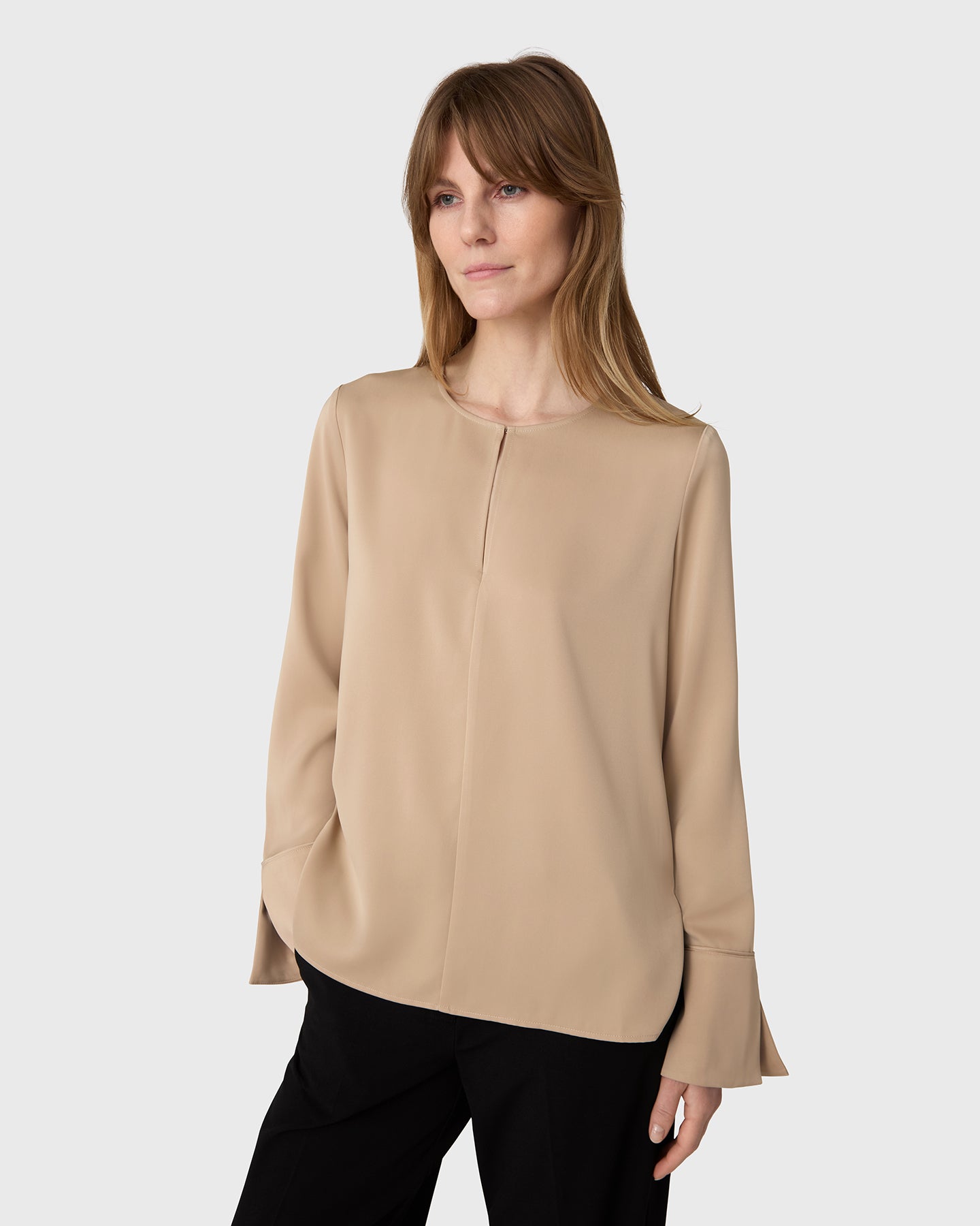 A timeless wardrobe essential with a soft twist. The Angela Blouse is cut from fluid satin stretch and features a rounded neckline with a feminine slit at the front. The subtle cuffs add a tailored finish to the relaxed silhouette, making it ideal for both professional settings and off-duty days. Tuck it into trousers or wear it loose for understated elegance.