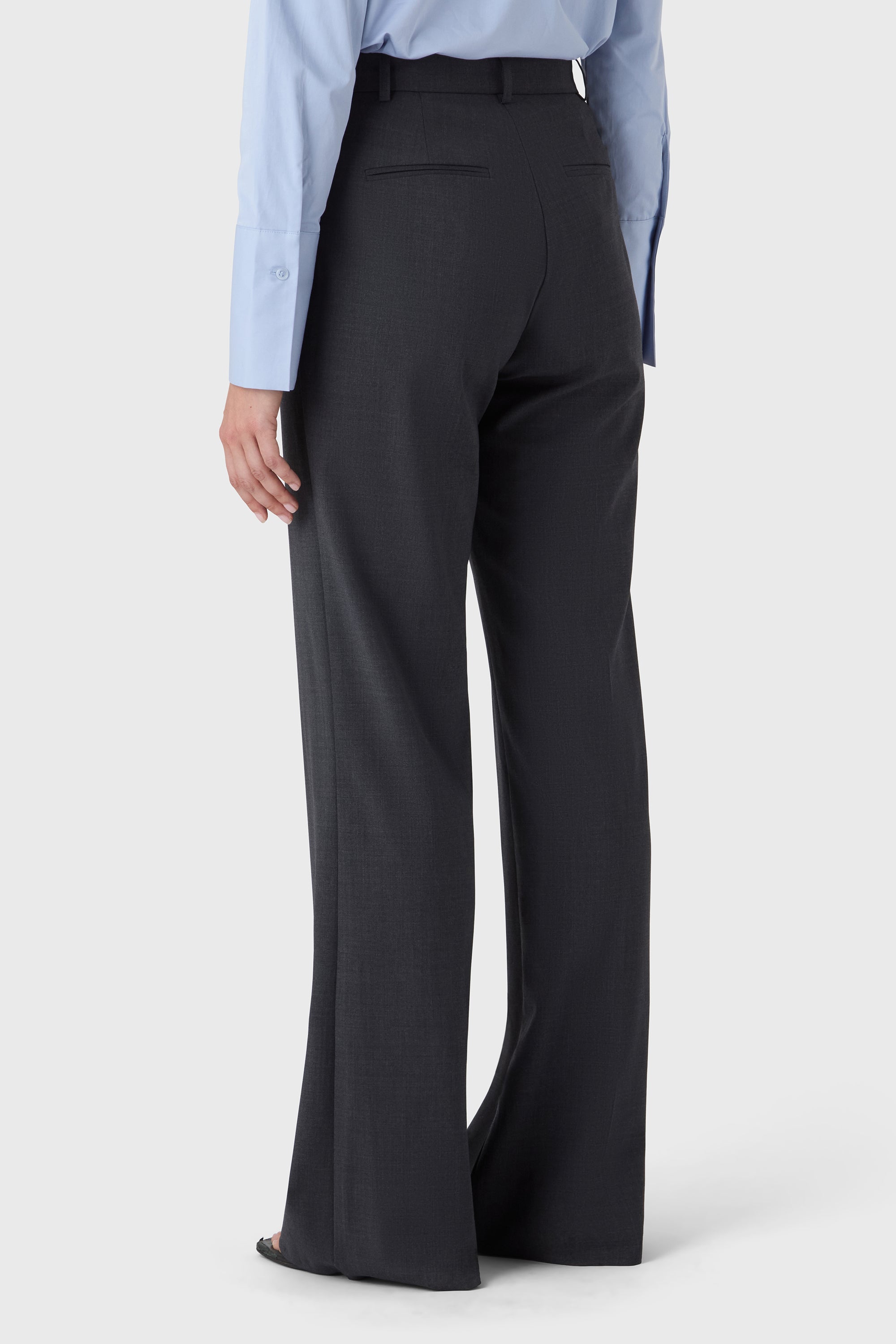 A modern take on tailoring. The Elle Trousers are cut from machine-washable wool stretch with a high waist, front zip and clean side pockets. The slightly flared leg creates a long, elegant silhouette — ideal with heels or a sharp flat.