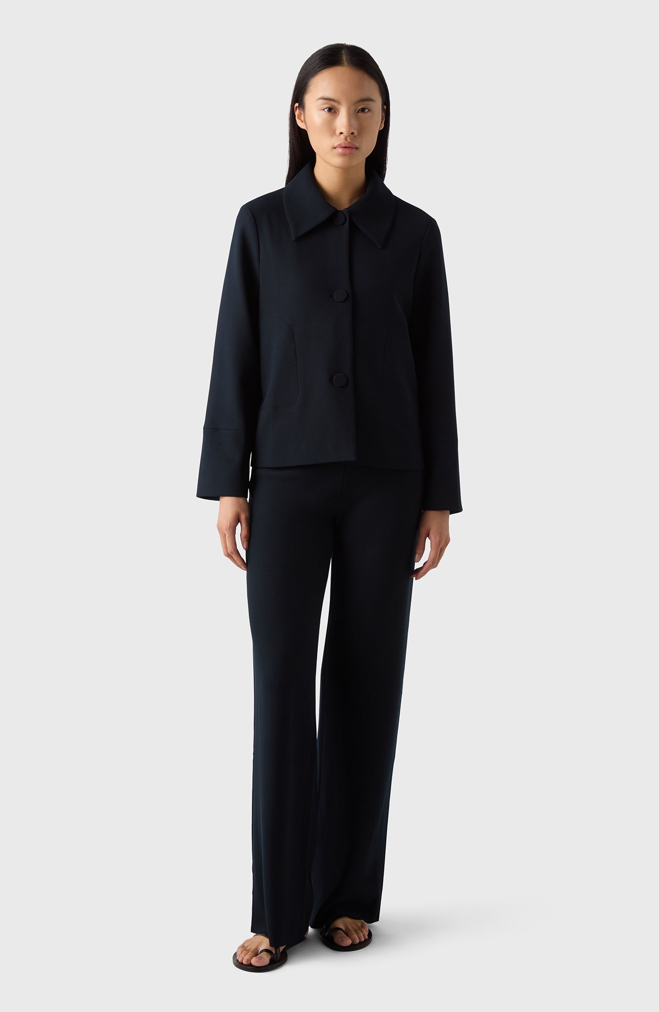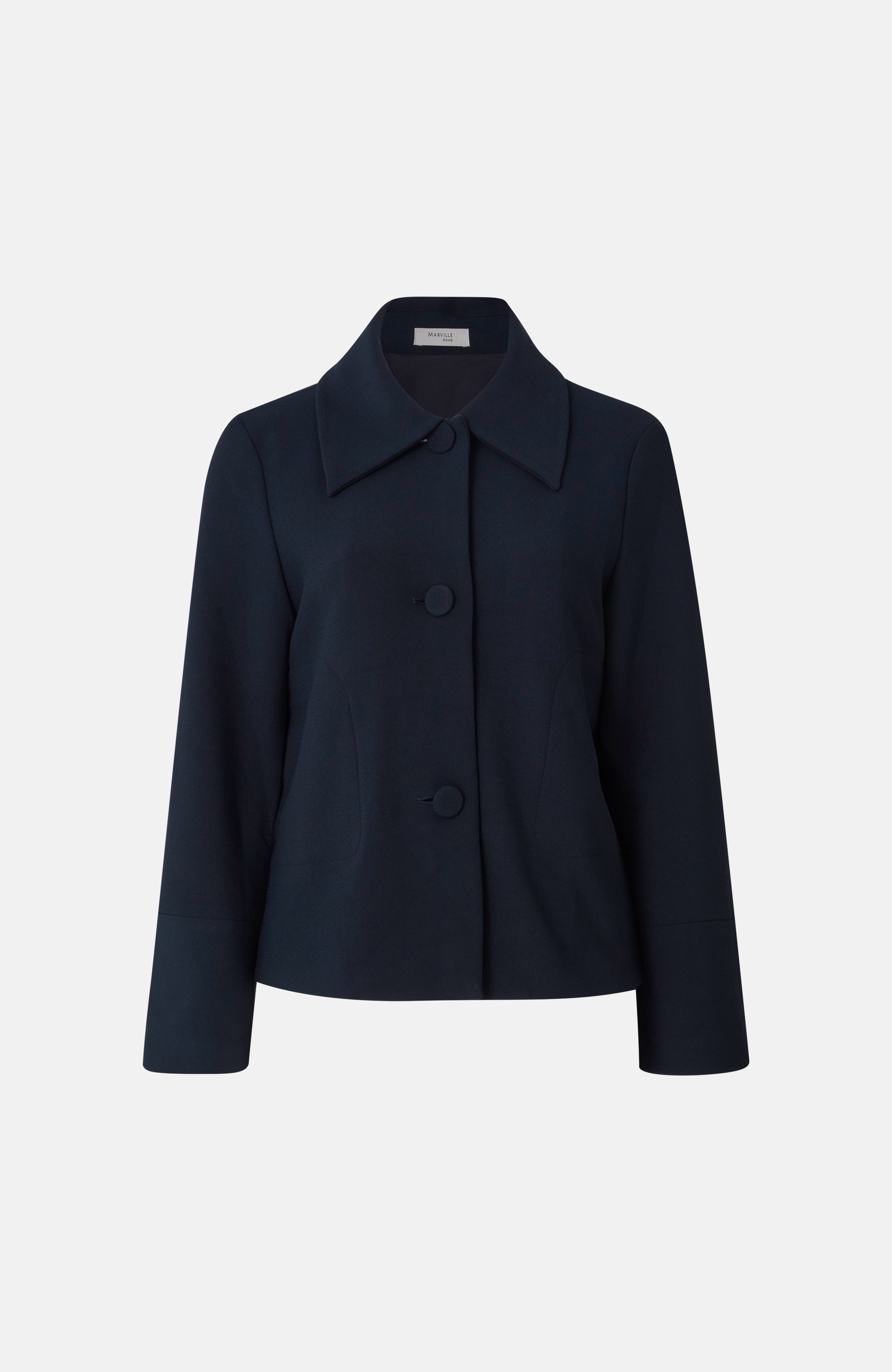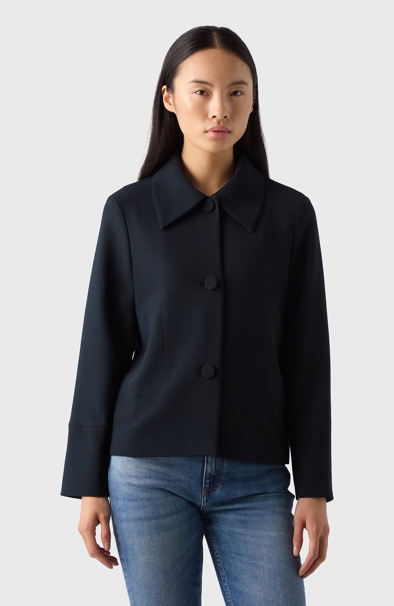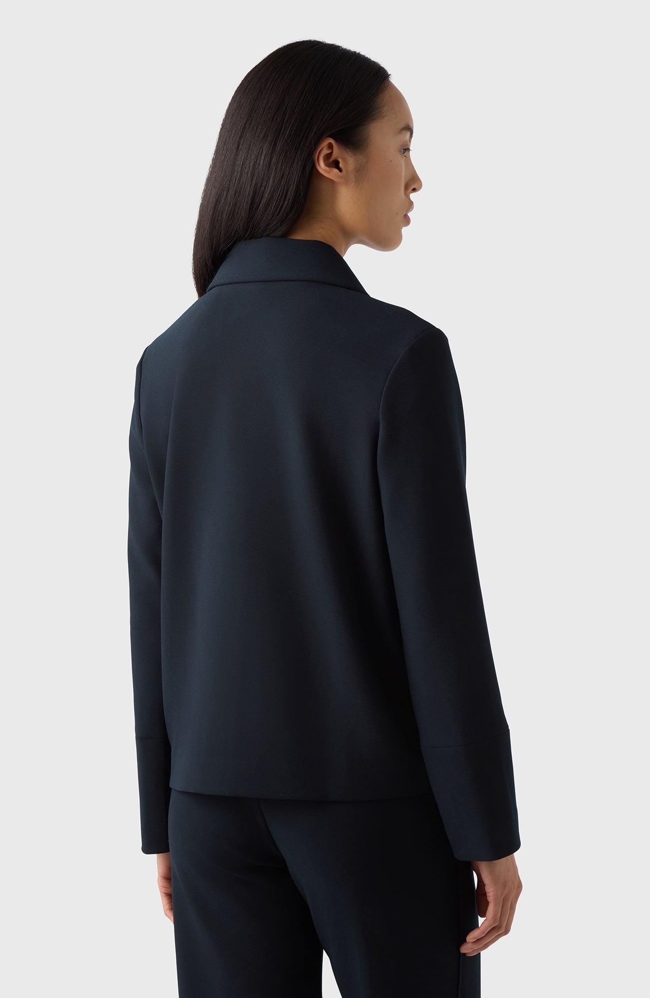 En jacka med en klassiska krage och så pass mjuk att den matchar ett lounge-set. Kavajen är bekväm tack vare det stretchiga crêpe-tyget som både är mjukt och lätt att sköta.