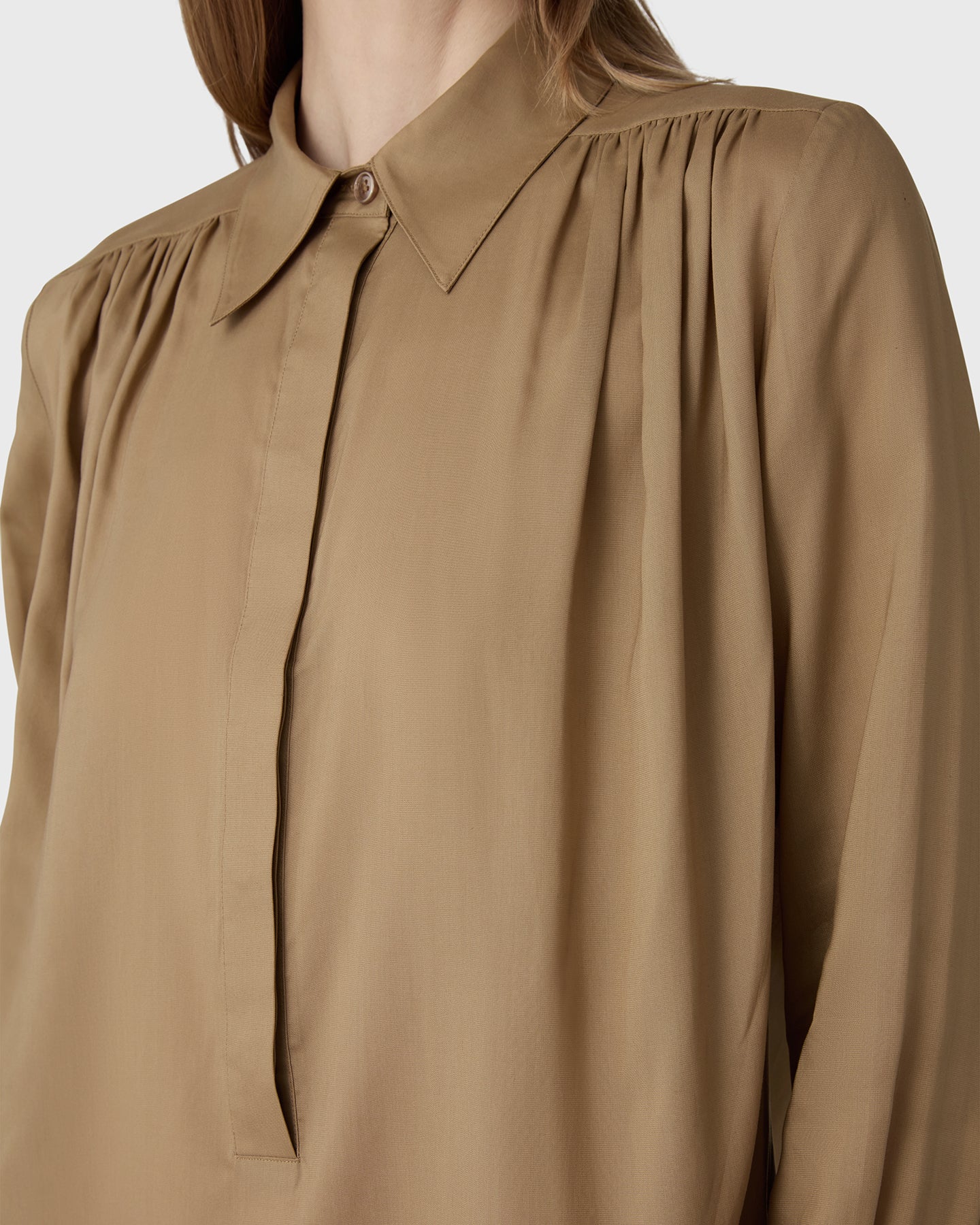 Långärmad blus med dekorativa veck, skuren i ett lätt och lätt transparent tyg. Den luftiga kvaliteten och de mjuka detaljerna skapar ett feminint och genomarbetat uttryck. Bär den med skräddade byxor för en mer uppklädd silhuett, eller med denim för en avslappnad och elegant vardagslook. En mångsidig blus som fungerar lika fint på kontoret som till middag.